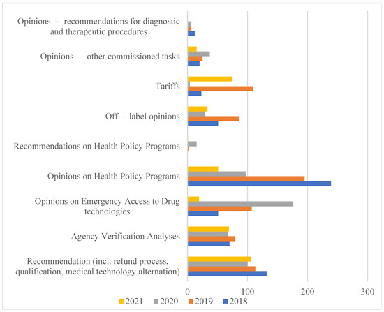 Therefore, in 2005, based on the Executive regulation of the Minister of Health, the Agency for Health Technology Assessment was established, which in 2009 obtained a state organizational unit with legal personality functions. According to the Act of 22 July 2014 amending the Act on healthcare services financed from public funds of 1 January 2015, the Agency received additional tasks related to the tariffication of healthcare services. In this way, the Agency for Health Technology Assessment and Tariff System (pol. Agencja Oceny Technologii Medycznych i Taryfikacji, AOTMiT) was established [7]. The scope of analyses carried out by AOTMiT is expanding every year, as evidenced by the increase in the number of employees and orders that are imposed on it in connection with the implementation of new solutions. They are aimed at creating a health policy based on data and reliable scientific information (Figure 1).