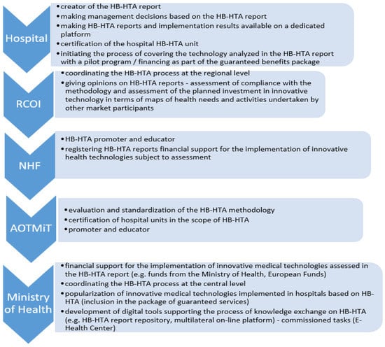 Respondents most often indicated that the institutions that should implement HB-HTA are the National Health Fund, the Agency for Health Technology Assessment and Tariffs, and the Ministry of Health. All of these units were considered the most competent in the field of HTA due to their human resources and the information collected in the databases. Furthermore, due to the involvement of the National Health Fund, it will be possible to introduce financial incentives related to the implementation of HB-HTA. The Ministry of Health was recognized as an important player due to its role as a legal regulator of the healthcare system. In this way, the respondents also indicated the benefits of an in-depth analysis of investments made in hospitals. The respondents did not mention institutions such as universities or research centers, for example. In most cases, the main roles of the above-mentioned institutions should include coordinating the entire process in the territory of the country and performing the function of the appropriate project leader due to the competences in these institutions. In addition, these institutions should have financial resources and experience, hence the respondents listed the National Health Fund, AOTMiT, or the Ministry of Health (Warmia and Mazury Voivodeship Office, Mazovian Voivodeship Office, Lower Silesia Voivodeship Office):
