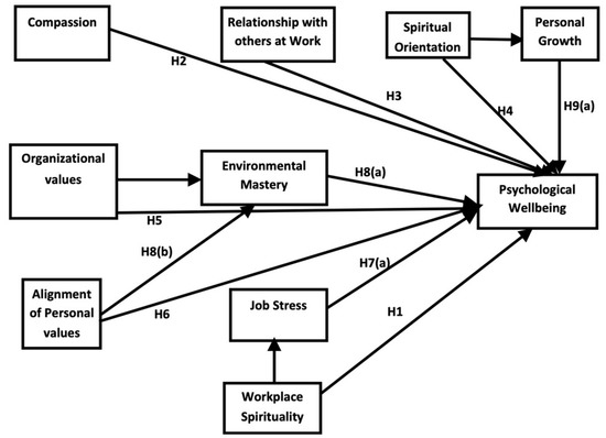 The uniqueness and novelty of this modified model also lie in the mediation of job stress, environmental mastery, and personal growth [68]. Previous literature demonstrated that job stress is an imperative and decisive factor in enhancing psychological well-being concerning workplace spirituality and psychological well-being. Ryff and Keyes’s [47] model presented spirituality, workplace spirituality, personal growth, and environmental mastery [37,64,72]. Several studies demonstrated that environmental mastery has a significant and positive influence on organizational values, and alignment of personal values as a mediator [71,72,73], and the psychological well-being of universities teachers [74,75,76,77]. Similarly, personal growth is also mediated between spiritual orientation and psychological well-being [65,66,67]. The following hypotheses are framed based on previous literature:
