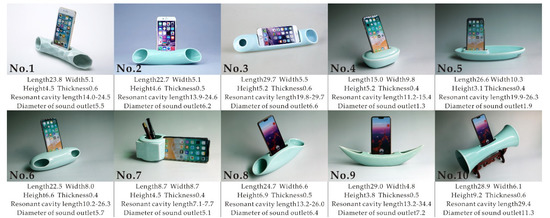 In this study, 10 ceramic passive amplifiers with different shapes were designed for mobile phones, forming a series. Samples 1, 2, and 3 belonged to the first category of amplifiers, with a slender body. Samples 4 and 5 belonged to the second class of amplifiers, borrowing the features of ancient ingot and boats. Samples 6 and 7 belonged to the third category of amplifiers. The modeling of sample 7 referred to the ancient jade cong. Samples 8, 9, and 10 belonged to the fourth category of amplifiers. Samples 8 and 9 were modeled after a bridge and a canoe, respectively, and sample 10 was a trumpet shape. The overall style of the sample was essentially simple, personalized, interesting, and integrated into the daily life environment. The ceramic material was selected from Yaozhou Kiln, one of the six kilns from the Song Dynasty. The Yaozhou Kiln represents typical celadon in northern China. Its composition is thin and strong, its translucent glaze is smooth and subdued, faint green in color, and is considered very elegant. The whole series not only have the elegant feeling of ceramic ornaments, but also the sound effect of spreading melodious music. Thus, it was given the name “porcelain Ming”. The specific parameters of all samples are shown in Figure 1.
