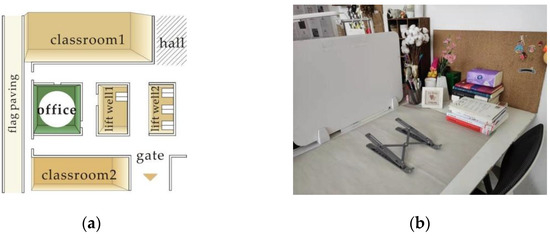 (a) Location of open-plan studio; (b) test environment in open-plan studio.