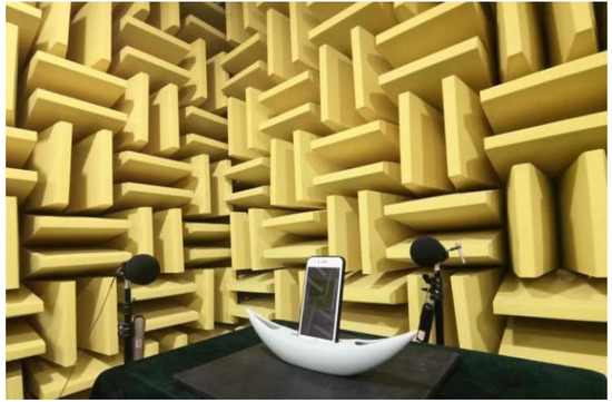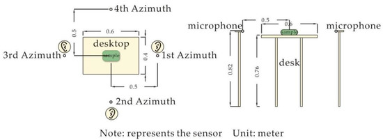 The 10 ceramic passive amplifier samples were placed on the middle of the table in the semi-anechoic room one by one. An NH-22A preamplifier and UC-57 test microphone were placed in four positive directions 0.5 m from the sample. The sequence arrangement of the four positive directions needs to simulate the listener’s auditory experience during actual use. As people to the front, left and right of the sound hole when the amplifier is in use, the right side of the sample sound hole was specified as the first azimuth; the second azimuth was determined as the front of the sample in a clockwise order; and the third and fourth azimuths were the left and rear, respectively. They were then connected to the SA-A1FTRTB4 portable measurement and analysis system (see Figure 3 for the layout of the equipment).