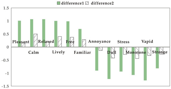 When white noise was played, the difference between “calm”, “relaxed”, “dull”, and “monotone” moods between the samples and no speakers was prominent. This suggests that soundscapes created by the samples were most helpful in restoring “calm” and “relaxed” moods, and prevented people from falling into “dull” and “monotone” moods. When playing a popular song, the difference between the samples and no speakers was significant in terms of “lively”, “dull”, and “monotone” moods. The results further confirm that all samples were most helpful in alleviating “dull” and “monotone” emotions.