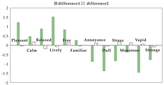 Table 10 and Table 11 show the results of assessing emotional perception. Whether white noise or a popular song was playing, all emotional scores of no speakers, the electronic speaker, and the 10 samples were statistically significant (p < 0.05). The post hoc LSD test showed that the “no speakers” scored significantly lower on six positive emotions (p < 0.05) and significantly higher on six negative emotions (p < 0.05) than all of the samples and the electronic speaker. The emotional score evaluation can be interpreted as follows: higher scores for six positive emotions or lower scores for six negative emotions indicate a higher comfort level of the soundscape. Therefore, the samples and the electronic speaker playing sound guided participants’ positive emotional perception.