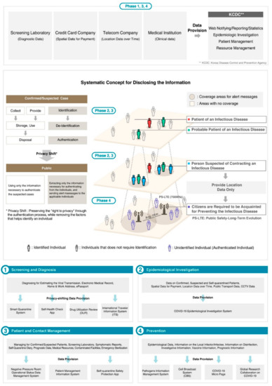 South Korea’s privacy-shift quarantine concept and model during the COVID-19 pandemic were applied to its overall control system. By shifting the concept of privacy protection from the two core functions of identification and authentication to the areas of authentication and object inclusiveness, we constructed a balanced information system that preserved individual privacy (Figure 1).