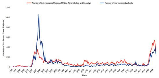 To analyze whether Korea’s quarantine policy affected the prevention and control of COVID-19, data related to Korea’s CBS system were collected. Figure 1 shows the system to prevent additional confirmed cases with a detailed explanation based on information on confirmed COVID-19 cases in Korea. Data were analyzed by collecting and identifying the daily number of confirmed cases published by the Korean government and the daily number of emergency disaster messages sent by the Ministry of Public Administration and Security. The study period was from January 2020 to August 2020, when the coronavirus appeared in Korea. The variables were set as the number of new COVID-19 cases and the number of emergency text messages sent by the Ministry of Public Administration and Security. Correlation analysis was performed to analyze the degree of correlation between the two variables. Figure 2 shows the results of analyzing this correlation.