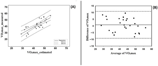 Linear regression between VO2max measured and estimated by equation 1 (panel (A)), and Bland–Altman plots (panel (B)). All plots were within 95CI. This data refers to the validation group.