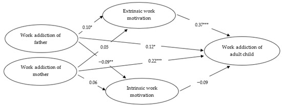 Figure 1. Proposed model linking perceived work addiction of parents and work addiction of an adult child (via intrinsic and extrinsic motivations). Note: The values in the model represent standardized regression weights; * p < 0.05, ** p < 0.01, *** p < 0.001.