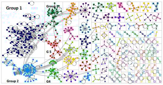 In Figure 1, each small node represents a specific Twitter user. Each time two users interact with each other (e.g., a comment to a tweet), a line is created between them. The clusters/groups in the graph represent the number of users discussing a specific topic and are dependent on how often users mention each other. The size of the nodes is proportionate to their BC scores, which measure this user’s influence on the flow of information to others [30,31].