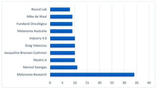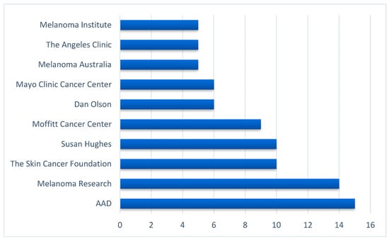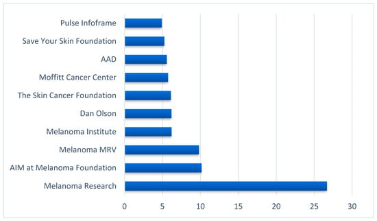 To identify the 10 top influencers, we computed BC scores and ranked them from the highest to the lowest. As displayed in Figure 2, melanoma-specific medical and research organization accounts, such as the Melanoma Research Alliance, AIM at the Melanoma Foundation, Melanoma Research Victoria, and a dermatologist represented the top influencers.