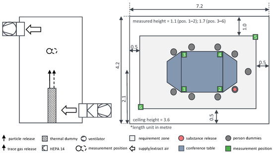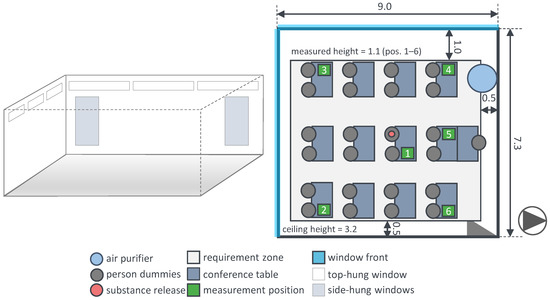 The investigation of air purification and natural ventilation is carried out successively. The experimental method for the air purifier is carried out in the same way as described in Section 5.1 using DEHS-particles. The reliable measurement of natural ventilation is conducted with trace gas. In this case, SF6 is released in a controlled manner analogous to Section 4, and its concentration is measured at six different positions. The periodic window opening is carried out manually according to a stopwatch. The room geometry and dimensions as well as the detailed set-up of the experiment including the positions of the substance release, the measurement and the air purifier are shown in Figure 7.