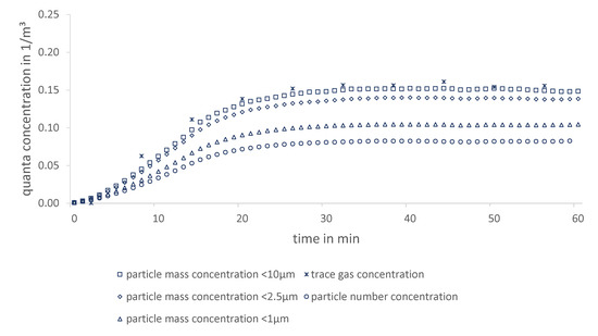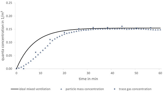 One key aspect of the study is to prove that both methods are concordant. Hence, a comparison between the two measuring methods for substance dispersion is essential. Bivolarova et al. [32] compare trace gases with different particle sizes on the basis of steady-state observations and decay curves of substance concentrations. A temporal resolution of these concentrations from the initial to the steady state—i.e., the dispersion of the substances—as well as a transfer to an infectious event is not focused here.