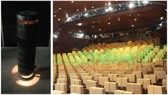 Besides supply and extract air effects, indoor airflows are influenced by sub- and over-tempered surfaces (e.g., thermal sources). For an appropriate simulation of human heat outputs for a certain activity rate (low activity: ) [34], thermal dummies with a surface area of an average human () [35] are recommended. Figure 3 shows a professional thermal person dummy and also a low cost variant (cartons with lightning bulbs inside) for substituting many persons in large rooms (e.g., Stuttgart Drama Theatre).