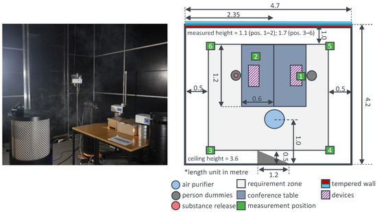 The particle measurement is analogous to the procedure described in Section 4. However, the filtered outdoor air is now replaced by recirculated air of a filtering air purifier. First, the room is freed from particles by the air purifier. Thereafter, the aerosol is subsequently emitted from the marked dummy (see Figure 4) with the properties of Table 1 over 60 min. The particle concentrations are determined by the OPCs at six different positions in the room in order to obtain spatial information about the substance removal.