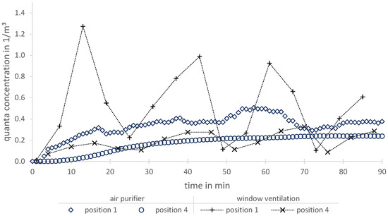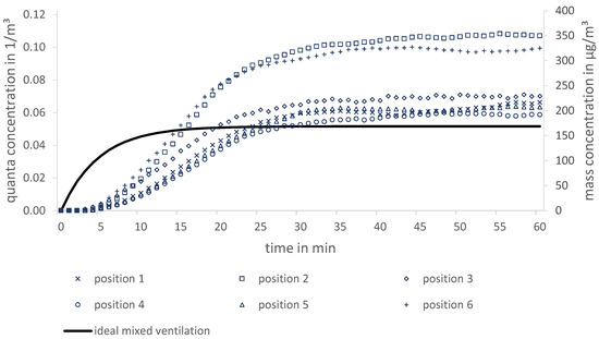 Depending on the ventilation principles (mixing ventilation, displacement ventilation, downward ventilation), the spatial deviations from the assumption of ideal mixed ventilation (in relation to the entire room) may vary. The deviations of the individual positions among each other show a significant benefit of a spatial view. Moreover, quanta concentrations in Figure 5 do not only mismatch the ideal mixed ventilation in the transient range but also in the steady state. In this case for a duration of 1 h, the overall infection risk (PIRA) for a medium spreader (delta variant) by Peng et al. [33] using Equation (2) results in a range from 2.2% (position 4) to 4.0% (position 2).