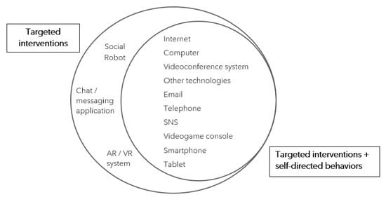 Most studied technologies were used in the context of targeted interventions. Moreover, only two of the included reviews covered both targeted interventions and self-directed behaviors—[28] and [32]. Among all covered technologies, three were studied exclusively in the context of targeted interventions, namely social robots, chat/messaging applications, and AR/VR systems (see Figure 2).