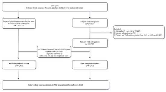 This research was a retrospective, case-compared, database cohort study for the evaluation of the different risks of developing PAD in an osteoporosis group and in a nonosteoporosis group. If patients were (1) older than 50 years of age and (2) had been diagnosed with osteoporosis (ICD-9-CM Code: 733.0) by a physician from 1 January 2006 to 31 December 2008, they were included in this study. If a patient had at least three different medical claims issued in an out-patient setting or at least one claim in an in-patient setting, they were defined as having osteoporosis. BMD measurement is the gold standard for osteoporosis diagnosis in the spine and hip and measures how different the mineral and calcium levels are in a particular area of the bone. A value of 2.5 or more in the standard deviation (SD) indicates osteoporosis. As shown in Figure 1, a total of 125,762 osteoporosis cases were identified after excluding 44,229 patients that were younger than 50 years old; 721 patients that had missing data; and 103,805 patients that had PAD, osteoporosis, or osteoporotic fractures, including vertebral compression fractures and hip fractures, from 2002 to 2007. A total of 2,541,021 patients without osteoporosis were included after the same exclusion criteria were applied. The nonosteoporosis cohort was verified as maintaining osteoporosis-free status throughout the entire follow-up period to minimize any allocation bias. The index date was determined from the first osteoporosis date. In order to avoid reverse causation bias, patients who were diagnosed with PAD within one year after the index date were excluded from the study. A 1:1 ratio was also used for propensity score matching along with the index year, age, and sex to reduce sampling bias. The final osteoporosis cohort contained 64,562 patients, with the comparison cohort containing the same number of patients after propensity score matching. Both cohort groups were followed up until the occurrence of PAD, death, or December 2018, whichever occurred first.