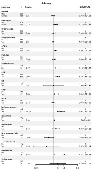 Table 1 displays the baseline characteristics and comorbidities of the study participants. There were 64,562 cases in the study and control groups. Their sex and age distributions were identical. Several comorbidities with significant differences between cohorts were found for hypertension, hyperlipidemia, chronic obstructive pulmonary diseases (COPDs), diabetes mellitus (DM), liver disease, congestive heart failure (CHF), rheumatoid arthritis (RA), chronic kidney disease (CKD), gout, and ischemic stroke. Regarding anti-osteoporosis drug usage, the osteoporosis group only had a high incidence of denosumab usage over their nonosteoporosis counterparts. On the other hand, the incidence of prescriptions of raloxifene, oral bisphosphate, zoledronic acid, and teriparatide were higher in the nonosteoporosis group than in the study group. There was no difference in ibandronate usage between both groups (p = 0.06).