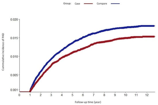 Peripheral artery disease (PAD) has frequently been investigated to determine its prevalence, pathophysiology, frequency and occurrence, management, and prevention in previous literature. Despite a decline in mortality rates, PAD remains highly prevalent due to the aging population, with a prevalence of approximately 10 to 20% []. In addition, the economic burden of atherothrombotic disease is high and is expected to increase with the aging population, demonstrating an increased survival rate. Moreover, the direct costs associated with PAD are even higher than those for coronary artery disease because of the higher rates of polyvascular disease and the higher number of annual cardiovascular (CV) events and hospitalization rates []. On the other hand, osteoporosis is a chronic degenerative disease that has incidence rates that increase with age. With its association with age-related fragile fractures, osteoporosis may progress without symptoms, and it is now recognized as a major threat to the elderly population. Studies are becoming increasingly focused on the links between atherothrombotic disease and osteoporosis from many aspects, including epidemiology and pathophysiology [,,]. Between the mineralization of bone tissue and the calcification of the blood vessel wall, there is abundant evidence that claims their association []. However, while osteoporosis represents a proven link between coronary heart disease and ischemic stroke [,], studies investigating the relationship between osteoporosis and PAD remain controversial. There is one small cohort study that discusses the association between PAD and osteoporosis, and the results found a weak and age-dependent association between PAD and osteoporosis that was only present in women []. A cross-sectional study in the USA reported that the prevalence of PAD was significantly higher in women with osteopenia (4.8%) and osteoporosis (11.8%) compared to in women with a normal body mineral density (BMD) (3.3%) (p < 0.001). Osteopenia (OR: 1.15) and osteoporosis (OR: 1.8) were found to be independent risk factors for the presence of PAD in women []. On the other hand, one study conducted in the Netherlands showed that women with a low femoral neck BMD had a significantly increased risk of PAD (OR: 1.49), but this was not the case in men []. Although both diseases have improved our understanding of the pathophysiological factors and associations shared by advanced science, the solid evidence-based studies investigating the etiologic role of osteoporosis associated with PAD are insufficient. Therefore, the purpose of this study was to observe and analyze NHIRD records to determine if osteoporosis is associated with PAD. The hypothesis for this study was that osteoporosis is correlated with an increased incidence of PAD.