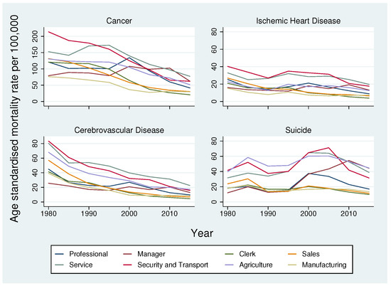 | Occupational Category | Cancer | Ischaemic Heart Disease | Cerebrovascular Disease | Suicide | ||||