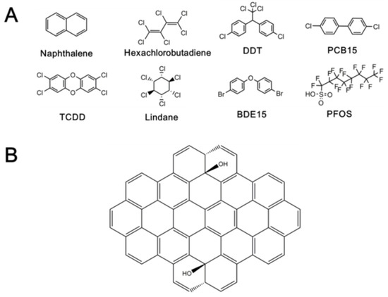 Several typical chemicals, naphthalene, hexachlorobutadiene, dichloro-diphenyl-trichloroethane (DDT), PCB15, 2,3,7,8-tetrachlorodibenzo-p-dioxin (TCDD), lindane, 4,4′-dibromodiphenyl ether (BDE15), and PFOS, as the representative of POPs were studied here. The information about these chemicals is listed in Table 2, and the structures are shown in Figure 1A. In the Stockholm Convention on Persistent Organic Pollutants (POPs), POPs are divided into three categories: pesticides, industrial chemicals, and unintentional productions. Eight ones commonly found in the environment were selected to cover the three categories for the present study. For PCDDs, PCBs, and PBDEs, which contain a variety of congeners, we selected the most representative ones, i.e., TCDD, PCB15, and BDE15, respectively. Therefore, the results based on these chemicals are also informative for the studies of other different POPs. The GO supercell (58 carbon atoms, Figure 1B) was selected as the proxy of GO.