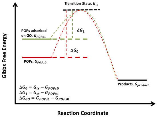 Here, is Gibbs free energy of POPs as mentioned above. The value is when the chemical is isolated, and the value is when the chemical is adsorbed onto the surface of GO. is sum of Gibbs free energy of all kinds of products, and its value is assumed not to be affected by GO. Before equilibrium, all reactants will experience transition state. By following these basic concepts, a diagram of the Gibbs free energy profile plotted versus the reaction coordinate is made (Figure 3). is the Gibbs free energy of POPs at transition state, (=) and (=) are the values of energy barrier. denotes the difference between and (). and of each chemical were calculated (Table 4). is systematically larger than , demonstrating that GO may affect the thermodynamic equilibrium of the reactions involved in the degradation. of DDT and TCDD are the largest ones, it may be attributed to the interaction between GO and multiple chlorine atoms of these chemicals, which is supported by the finding that GO is capable of adsorbing chlorine atoms [35].