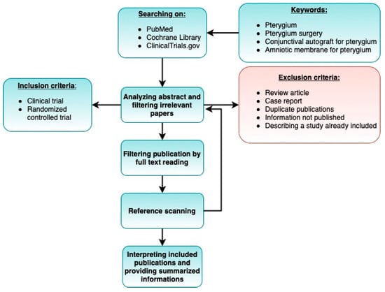 We searched PubMed, Cochrane Library, and ClinicalTrials.gov on 12 November 2021 to identify relevant studies. The following keywords were used: “pterygium”, “pterygium surgery” or “conjunctival autograft for pterygium”, and “amniotic membrane for pterygium”. We did not apply restrictions for language or date of publication.