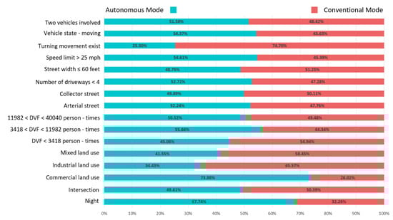 Before modeling, some typical variables that describe driving conditions were picked out and a percent-stacking bar chart was plotted. As can be seen from Figure 1, the proportion of each selected variable, such as the time of crashes (Night), road characteristics (Speed limit, Street width, Number of driveways, Street type), type of the crash places (Daily visitors’ flowrate (DVF), Intersection, Land use), and vehicle state at the time of crashes (Turning movement, Vehicle state) was similar, which meant crashes in the autonomous driving mode and conventional driving mode occurred under similar conditions, and they were comparable.