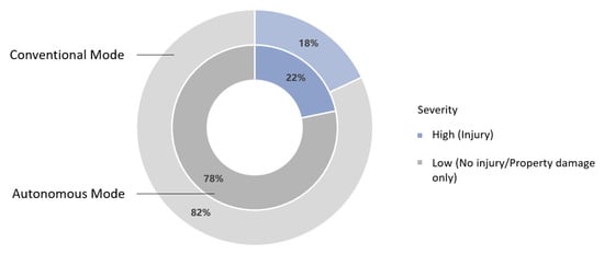 As shown in Figure 2, in the conventional driving mode, the proportion of crashes with injury was 18%, similar to that of the autonomous driving mode (22%).