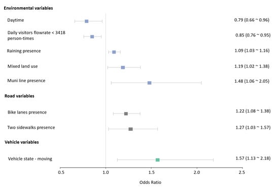 As shown in Table 3 and Figure 3, compared to no crosswalk roadway or road with only one side crosswalk, the likelihood of high crash severity was increased at roadways with crosswalks on both sides by 27% in the autonomous driving mode (OR = 1.27). Lots of research about the interaction between pedestrians and AVs have shown that the ability of AVs to detect and understand responses from pedestrians and respond appropriately is not yet complete [72,73]. Without pedestrian-to-driver communication (e.g., eye contact), pedestrian behavior becomes more unpredictable [74].