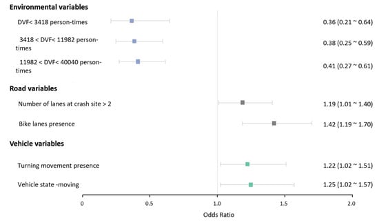 For the conventional mode, the number of lanes at the crash site, bike lanes presence, turning movement presence, moving, and vehicle state all positively affected crash severity, whereas DVFs (<3418, 3418~11,982, and 11,982~40,040 person-times) were negatively associated with crash severity.