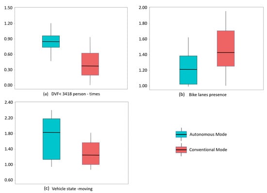 Although some influencing factors had the same positive or negative effects on crash severity under both driving modes, their degrees were different. The impact of daily visitors’ flowrate (DVF) on crash severity in the autonomous driving mode was smaller than that in the conventional mode since equipped with advanced sensing equipment, AVs can sense a longer distance and were superior to humans in the recognition of specific targets (e.g., face, text, etc.) [94]. In addition, the presence of bike lanes would lead to a great increase in the severity of crashes in the conventional driving model, while the moving vehicle state had a greater impact on the crash severity of autonomous driving.