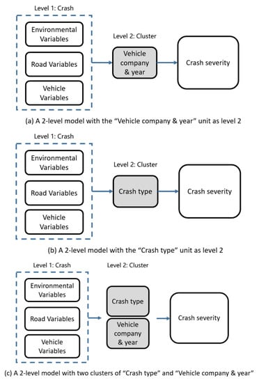 In addition, the differences between models with different observation units were also explored. As shown in Figure 6a, in this study, vehicles with the same vehicle year from the same company (i.e., the “Vehicle company & year” unit) were considered as a cluster (Level 2) to alleviate the effects of unobserved heterogeneity, and there were several sub-clusters per cluster, i.e., each crash (level 1). To consider the possible interconnect role of collision manner in the relationship between independent variables and crash severity, “Crash type” was taken as the criterion for classifying clusters (See Figure 6b). Since studies have shown that robust parameter estimation cannot be made in the hierarchical Bayesian model if clusters in level 2 were too little [83], “Crash type” was not a dichotomous variable here, but was classified into 6 groups, including “Rear-end”, “Sideswipe”, “Head-on”, “Hit pedestrian”, “Hit non-motor vehicle”, and “Others”. Moreover, while considering the unobserved heterogeneities caused by both “Vehicle company & year” and “Crash type” (See Figure 6c), another hierarchical Bayesian model with two clusters was also attempted.