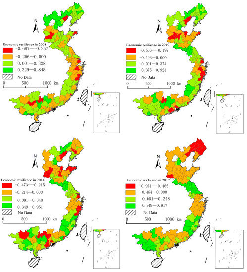 where Δ E r t + k represents the actual change of GDP of region r in the contraction period (t + k). The value of Resis r was around zero, and when the value of Resis r was positive, a region was more resistant to the shock than the national average level. This study focuses on the Great Financial Crisis that occurred in 2008. The GDP growth rate of coastal areas experienced roughly the same development trend as China, which peaked in 2007, declined in 2008, recovered briefly in 2010, and then declined again. After 2017, China’s economy has begun to be impacted by new disturbances such as Sino–U.S. trade friction and COVID-19. We define the period from 2008 to 2017 as the recession period and use the economic resistance to indicate the regional economic resilience.