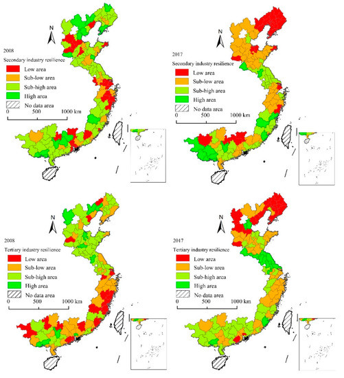 We analyzed the spatial distribution of secondary and tertiary industry resilience at different stages of the crisis, and we divided the cities into four categories (Figure 6). When the economic crisis broke out in 2008, there were 42 cities belonging to the low and sub-low areas of the secondary industry resilience, and 57 cities belonging to the low and sub-low areas of the tertiary industry resilience. Cities with low secondary industry resilience were mainly distributed in Hebei, Shanghai, Southern Jiangsu, and Northern Zhejiang, and the low value of tertiary industry resilience was mainly concentrated in the south of coastal areas including Shanghai, Zhejiang, Fujian, and Guangdong. In 2017, the number of cities with low secondary and tertiary resilience increased to 70 and 62, respectively. The low-value agglomeration areas of secondary and tertiary industry resilience had high coincidence, and were mainly distributed on the Bohai Rim area, Southern Jiangsu, and the Northern Zhejiang area. Both secondary and tertiary industry resilience in low area cities was mainly concentrated in Liaoning Province.