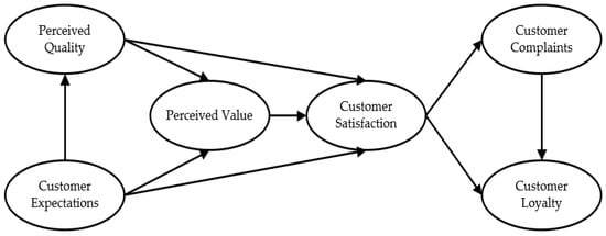 Public satisfaction originated from customer satisfaction theory. The concept of “customer satisfaction” was first introduced in Oliver’s “expectation and paradox” theory. Customer satisfaction is the comparison of the actual results of products and services with the expectations before purchase []. Several models of customer satisfaction theory have gradually formed, such as the Sweden Customer Satisfaction Barometer (SCSB), the American Customer Satisfaction Index (ACSI) and the European Customer Satisfaction Index (ECSI), which are in continuous development. Among them, the American Customer Satisfaction Index [] (as seen in Figure 1) is the most widely used. The model mainly links customer satisfaction and its influencing factors—such as customer expectations, perceived quality and perceived value, etc.—for analysis. Some scholars in public administration have also applied the ACSI model to the study of satisfaction with government public services []. This paper will focus on public satisfaction with community services for COVID-19 based on the ACSI model.