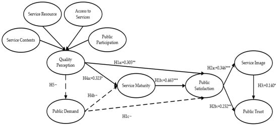The results of the public satisfaction model. * p < 0.05; ** p < 0.01; *** p < 0.00.