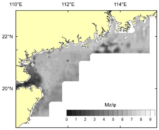 There are various types of sediments distributed from clay to sand in the research area, and the mean particle size of sediments is mostly between 3 and ~8 φ. In the Pearl River Estuary (A), the sediments are dominated by fine silt with 7~8 φ of mean particle size. However, there is a patchy high-value area outside the Pearl River Estuary (B), and the sediments are mainly fine silt with a particle size between 3 and 4 φ. The large area of the western Guangdong Sea is dominated by silt with a particle size of 7~8 φ, while the sediments in the Qiongzhou Strait and the eastern part are the coarsest in particle size with a particle size less than 3 φ and are mainly composed of coarse and medium sand (Figure 2).
