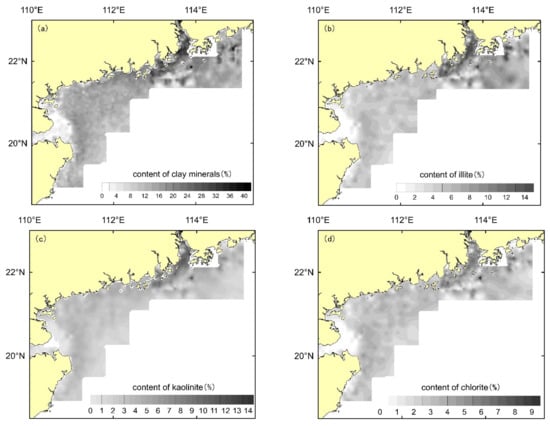 Distribution of clay minerals. (a), distribution of clay minerals, (b), distribution of illite; (c), distribution of kaolinite; and (d), distribution of chlorite.