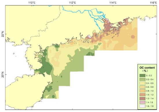 - The source of OC in sediments in the study area was mainly input from the Pearl River. The content of OC in sediments is much higher in the Pearl River Estuary and the surrounding areas, and it is not strongly affected by sediment types. The sediment types in the western part of the study area have an important impact on the distribution of OC.