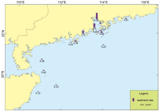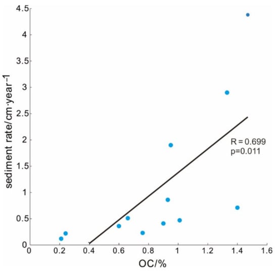 The deposition rate is another important factor affecting the burial of OC, and it is generally suggested that a higher deposition rate more easily preserves organic matter [,]. The deposition rate in the study area is obviously higher in the estuary than in other areas, and the deposition rate in the top of Pearl River Estuary is the highest. From the Pearl River Estuary to the western sea area, the deposition rate shows a decreasing trend, and the OC content also decreases, and the same trend is also shown from the Pearl River Estuary to the open sea. On the whole, the study area is also consistent with the characteristics of high OC content with higher deposition rates (Figure 8).