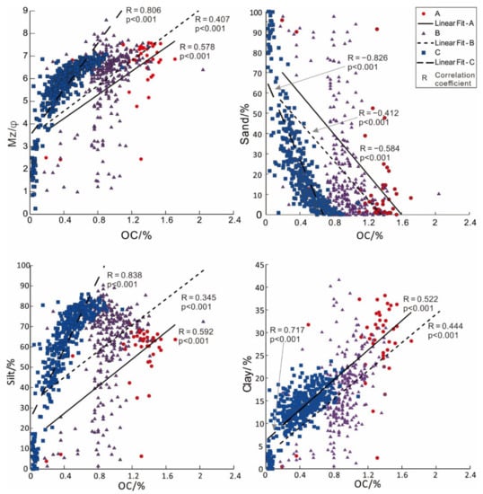 The particle size has an important influence on the OC content (Figure 6); the Mz value (φ) of sediments in the survey area is positively correlated with the OC content, and the sand content is negatively correlated with the OC content, while the silt and clay are positively correlated with the OC content. From the perspective of regional distribution, the correlation outside the Pearl River estuary is lowest, followed by that inside the Pearl River Estuary due to the high overall OC content, which reflects less control by particle size or hydrodynamics. In the areas where the OC is not too rich in the western Guangdong Sea and northeastern Hainan waters (C), the correlation is significantly higher, indicating that the size of sediment particles basically determines the content of OC in this region.