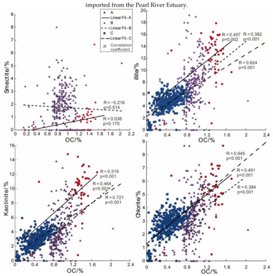 The particle size analysis results show that fine-grained components in sediments are more likely to coexist with OC. Although the mechanisms of OC binding to mineral surfaces are currently unclear, various adsorption mechanisms (van der Waals interactions, ligand exchange and cation bridging) should play an important role []. Fine components in sediments are mainly clay minerals, and the correlation analysis of OC content with illite, smectite, kaolinite and chlorite by region shows that in the survey area, except for smectite outside the Pearl River Estuary, all other clay minerals are positively correlated with OC. Among all types of clay minerals, kaolinite has the strongest correlation with OC, followed by illite and chlorite, and smectite has the weakest correlation (Figure 7).