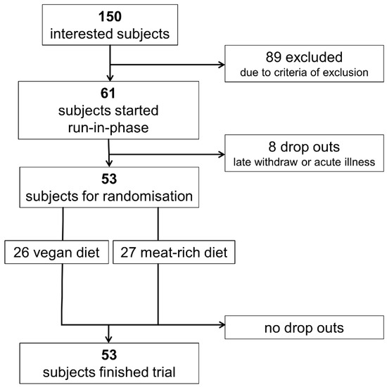 Out of 150 interested persons, 53 participants were eligible for inclusion and were willing to participate; 26 participants were randomly allocated to a vegan diet and 27 participants were randomly allocated to a meat-rich diet for four weeks. The flow of participants is shown in Figure 1. All participants completed the study as per protocol. At both time points (baseline and end), BMI did not differ significantly between the groups. The intake of energy was similar in both groups (Table 1) and was within the recommendations set forth by the DGE for healthy adults [34]. Demographic data of included participants are shown in Table 1.