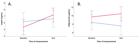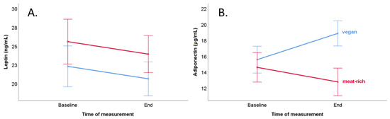 Course of leptin and adiponectin levels of the vegan group (blue line) and meat-rich group (red line) during the trial with consideration of potential confounders (BMI and age) in men. Bars show standard error ± 1. (A) Course of serum leptin concentration (ng/mL). (B) Course of serum adiponectin concentration (µg/mL).