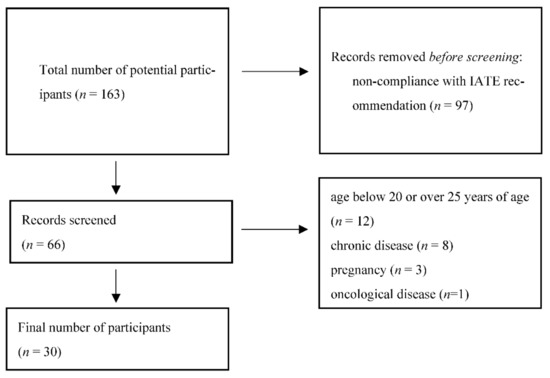 The number of physiotherapy students at the Faculty of Public Health of the Medical University of Silesia was 820. The number of participants in the study was determined using the statistical tool available at https://www.naukowiec.org/dobor.html (accessed on 1 January 2020) [31] and https://www.statystyka.az.pl/dobor/kalkulator-wielkosci-proby.php (accessed on 1 January 2020) [32]. Assuming the relative error value of 7% (as used in medical research), the required number of participants is 159. Based on the analysis of medical records, the initial number of participants was 163 (p-value < 0.05), and then, 30 participants were enrolled in the final analysis based on the inclusion and exclusion criteria. For a group of 820 students, the maximum error value was estimated at 18%. Therefore, assuming a p-value < 0.05, the required number of respondents in the study was 29 (p-value < 0.05).