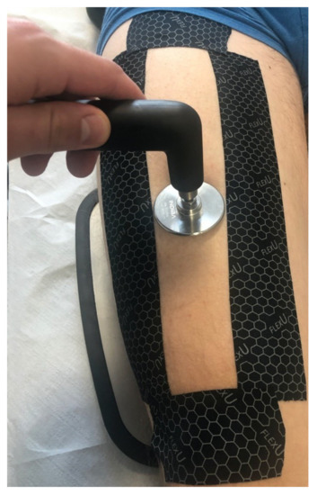 For the duration of the procedure, participants were placed in a supinated position. In the middle of the length of the hamstring muscles, a passive electrode was placed along the course of the muscle fibers. The area of the body undergoing surgery includes the area of the rectus femoris and was marked with a rectangle made out of elastic therapeutic tape. Its dimensions were 4 cm in width and 40 cm in length. The width of the treatment area was adapted to the size of the probe in order to limit the use of the therapeutic dose to only the location undergoing the procedure. The movement of the active probe was conducted along the course of the muscle fibers, while its movement was adapted to the sound of the metronome set at a frequency of 1 Hz. The probe was inserted in such a way as to not touch the plaster rectangle.