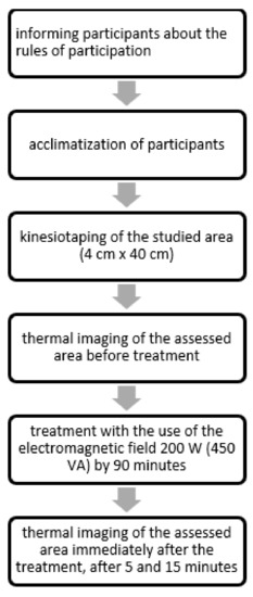 The study included participants, physiotherapy students in the Faculty of Public Health in the Medical University of Silesia in Katowice, Poland aged 20–25 who gave informed, voluntary consent to participate in the study and had no contraindications for therapy using the electromagnetic field. In addition, the criterion for inclusion in the study was to answer all the questionnaire questions confirming the fulfillment of the IATE conditions. The study included people who refrained from consuming hot or cold drinks, products and did not apply any cosmetics to the study area on the day of the study 5 h prior to the study. The study included participants who did not report chronic disease, mental disorders, pregnancy, oncological disease (now or in the past), did not have surgery in a lower limb, or did not have lower limb pain lasting more than 3 days.