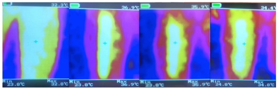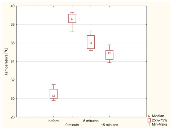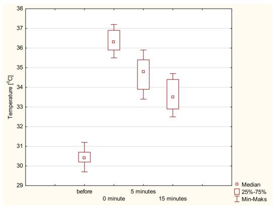 The course of changes in temperature distribution on the tested surface was presented in the form of thermograms for one randomly selected participant. The remaining thermograms were similar to the example (Figure 4).