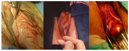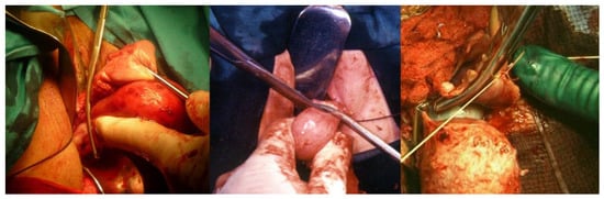 Figure 5. On the left, the exposure of the uterine artery; in the center, the ligation of the uterine vessels after cutting it; on the right, the dissected and tied uterine arteries. - 6.
